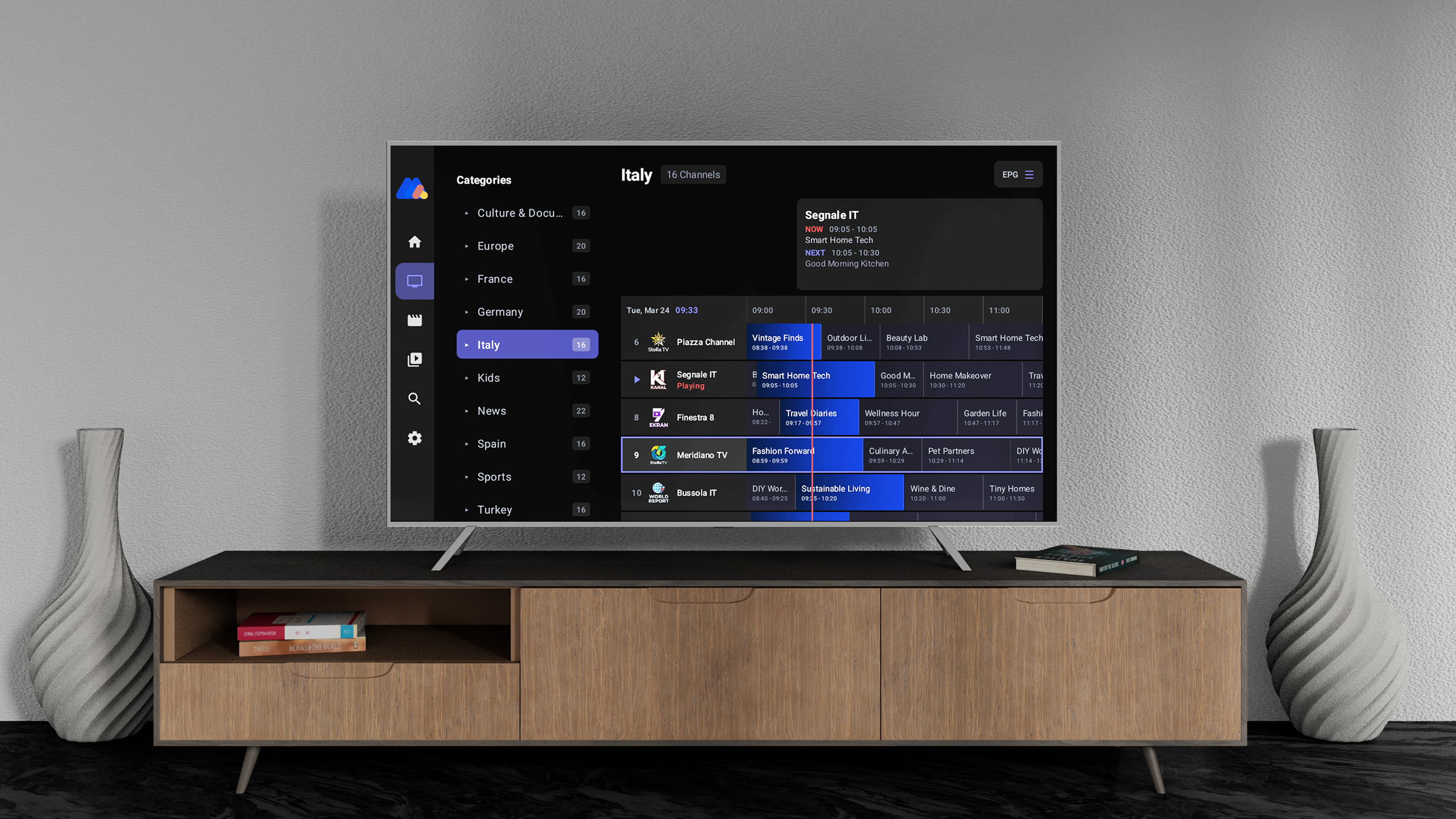 Full electronic program guide as an overlay. See what's on now and next, browse the 7-day schedule — all without interrupting playback.